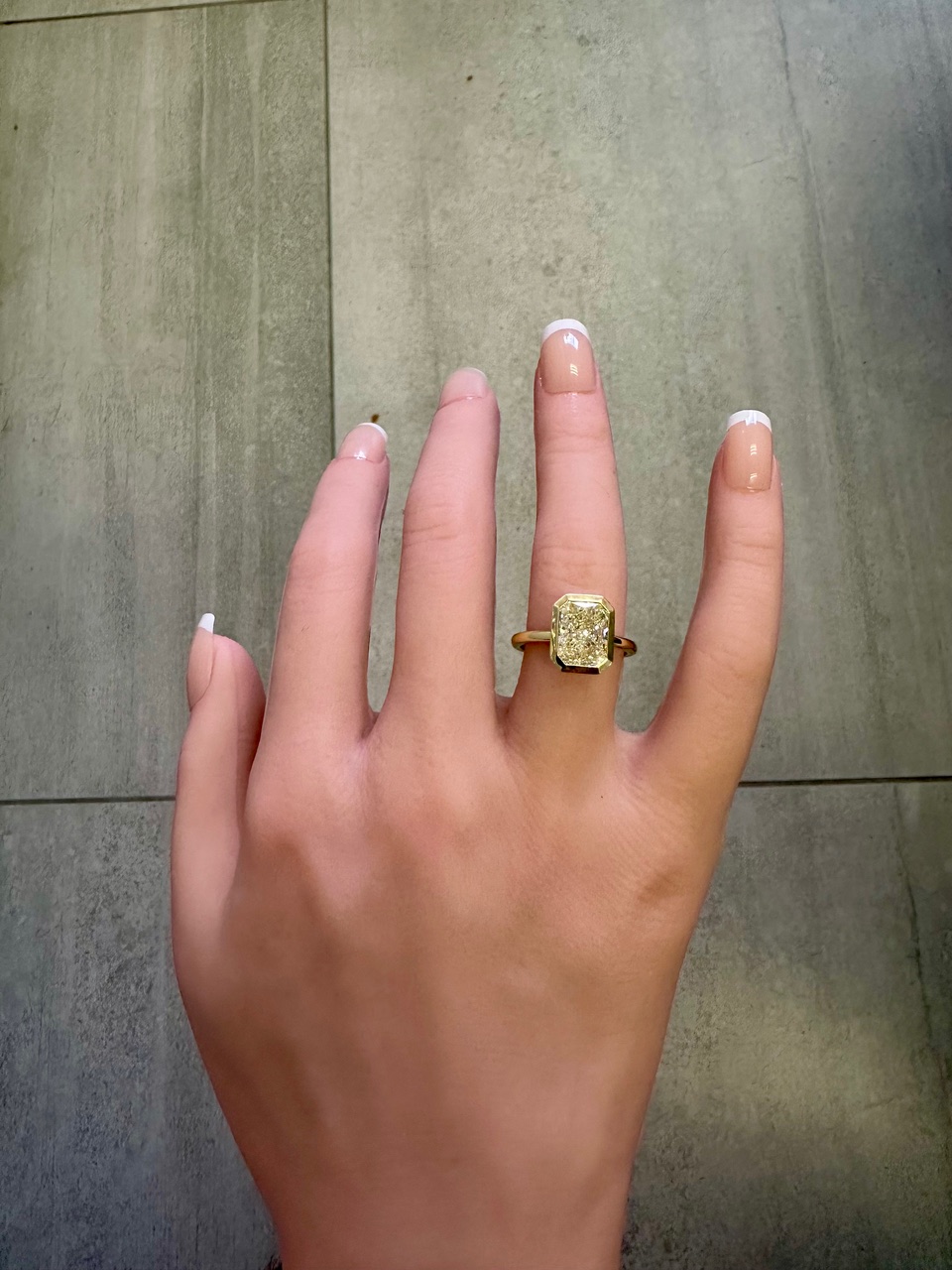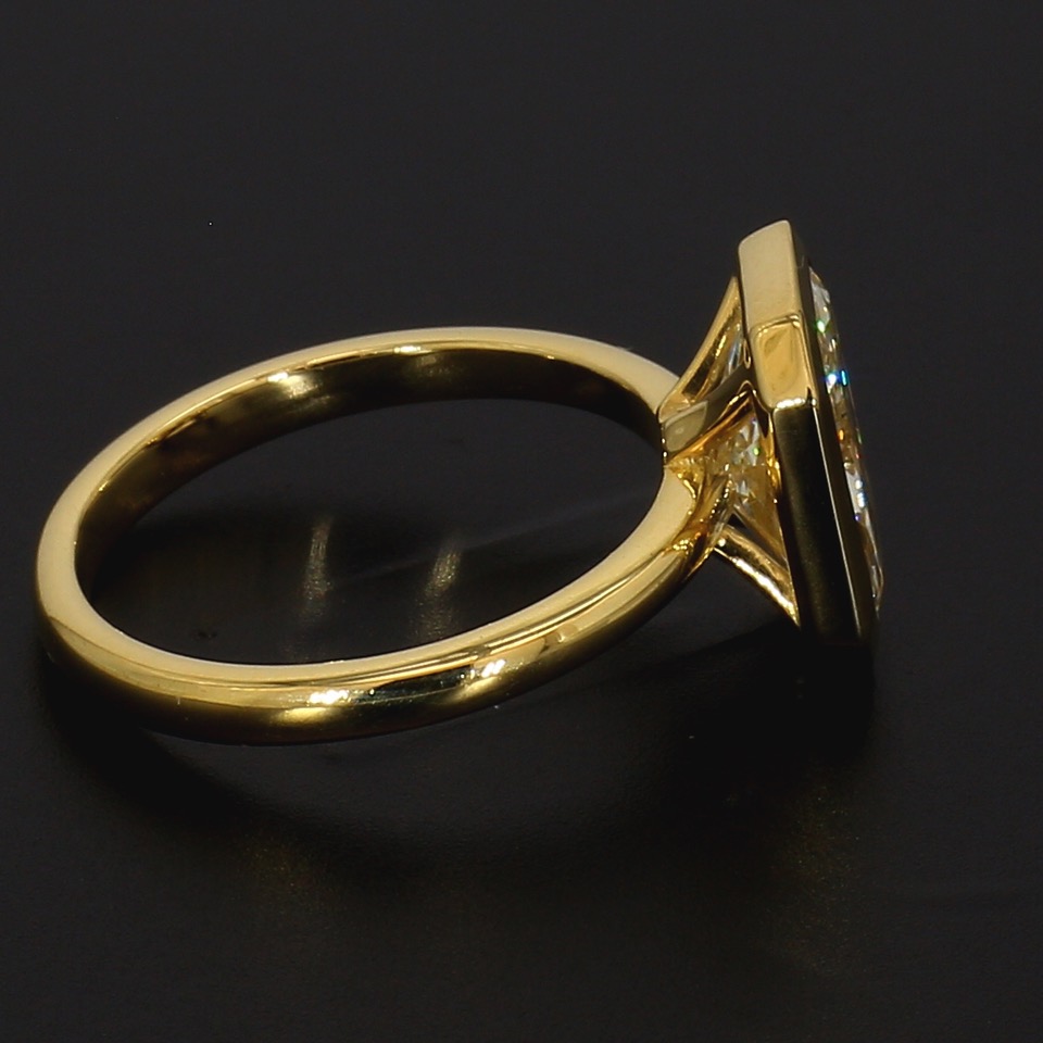 Inspired by current trends in retro style rings, this 18k yellow gold diamond ring will take her breath away. Featuring a perfectly cut elongated radiant diamond, full of scintillation, bezel set in luxurious yellow gold, the simplicity speaks for itself. 4.91g 18ct yellow gold. 3.08ct L VVS1 XXN RADIANT cut natural diamond. Finger Size “M1/2”.