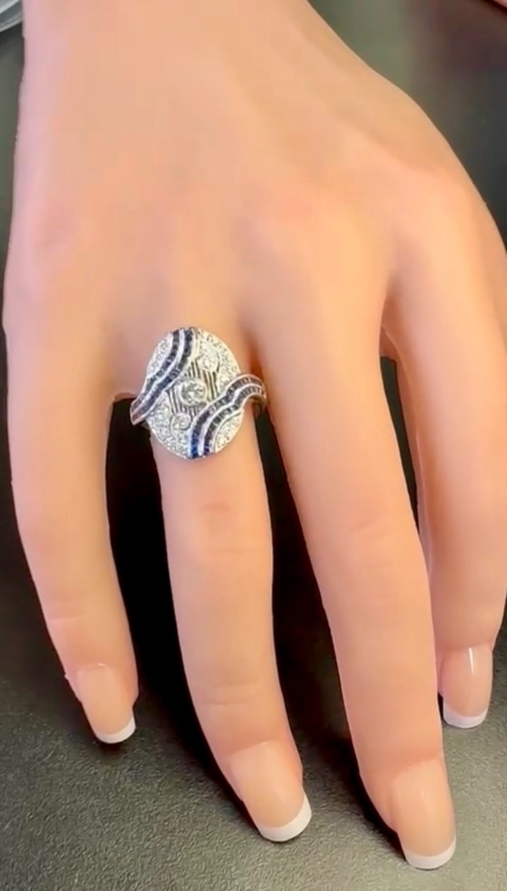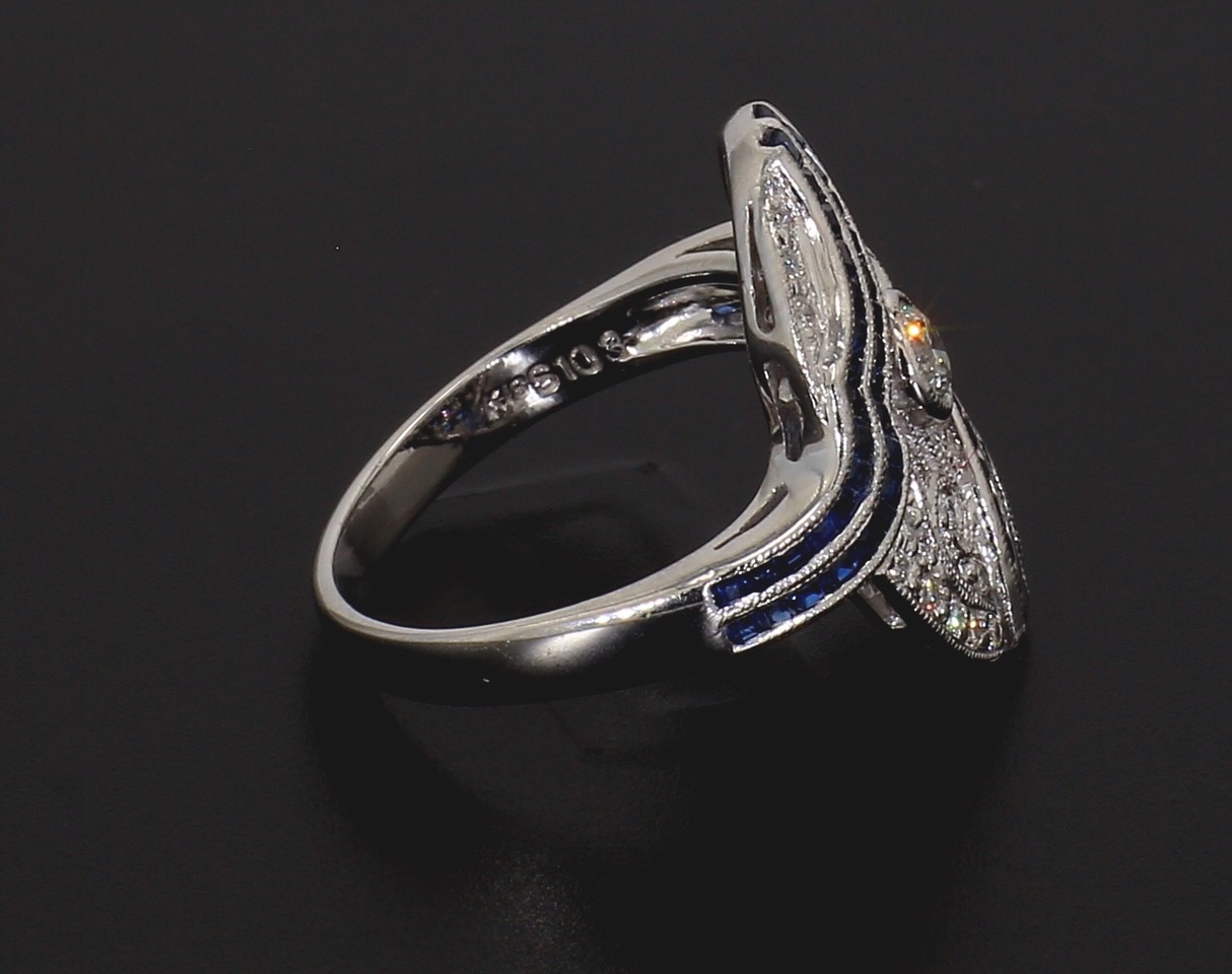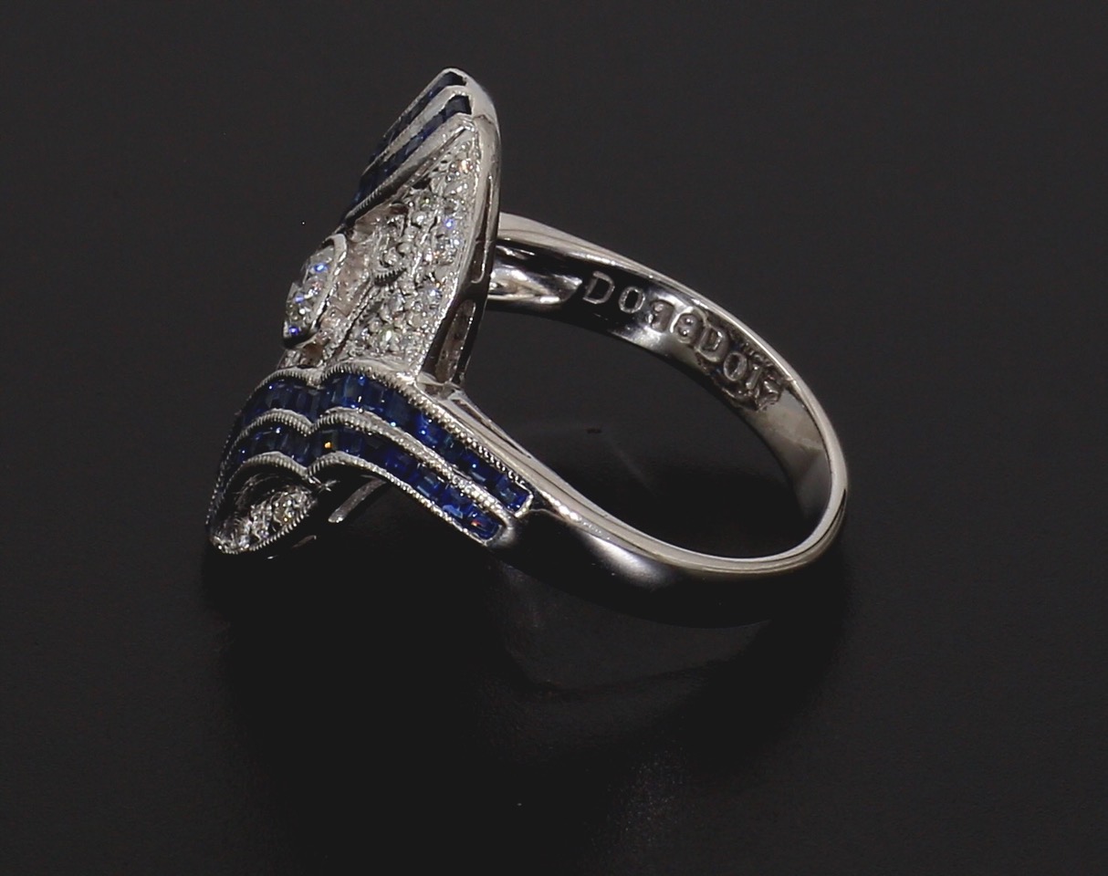 CALLING ALL COLLECTORS. This 18ct white gold Art Deco style ring is an absolute beauty, the ring features channel set square blue sapphires complemented by pavé set white diamonds. The detailing has been enhanced with fine millgrain work. The ring is petit, well balanced, really striking, unique and a definite conversation starter. Hallmarked as follows “K18” “S103” “D018 D017"