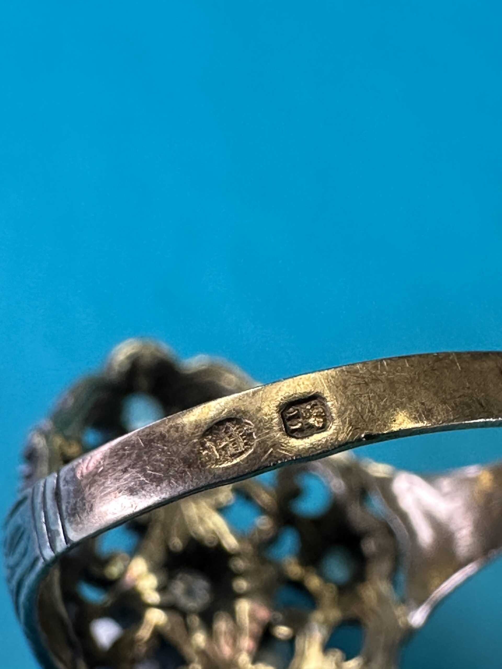 Sterling Silver and possibly 19ct gold ring. The ring is hallmarked, indicating possibly Portuguese origin around 1900's. The ring is set with 1 old mine cut diamond around 0.10cts, and 4 rough cut diamonds around 0.03cts each. Condition is used, showing some wear and tear. This is a unique ring, showing serious skill in handmade jewellery techniques. A beautiful, one of a kind piece. Stunning dress ring or engagement ring unlike any other